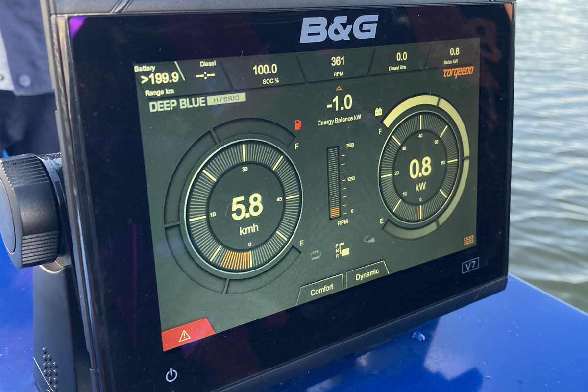 De temperaturen beneden het vriespunt bleken geen enkele aanslag te betekenen, niet op ons enthousiasme en niet op de techniek. Teleurstellingen en haperingen bleven uit. De elektrische voortstuwing leverde indrukwekkende prestaties en ook het gevuld houden van de accu’s door de waterstofcel verliep uitstekend. Een eerste kennismaking met blije gezichten tot gevolg! Interessant om de verhoudingen te zien en te voelen, tussen het relatief forse gewicht van de boot, de kracht van de elektrische Torqueedo outboard en de wijze waarop de waterstofcel zijn werk doet om de accu’s gevuld te houden. Het display geeft alle benodigde (onmisbare!) informatie overzichtelijk weer en wij voelen ons er snel mee thuis. Direct zijn wij op zoek naar een optimale balans tussen kruissnelheid in plané,en verbruik. Met lage snelheid manoeuvrerend in de haven is het mooi om te zien dat de waterstofcel de accu’s weer aanvult; een vreemd aandoend proces in de omzetting van moleculen naar elektronen in dezelfde boot.