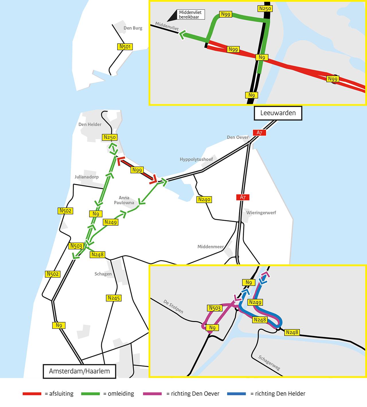 Verkeer komende uit de Kop van Noord-Holland en Friesland volgen de N99 en vervolgens de N249 via Anna Paulowna en De Stolpen naar de N9. Het verkeer dat uit de richting Hoorn / Middenmeer komt, dient de N248 via de Stolpen en vervolgens de N9 naar Den Helder te nemen. Verkeer komende uit de richting Amsterdam wordt geadviseerd de A9 te volgen en de N9 richting Den Helder te nemen. U dient rekening te houden met een extra reistijd van 20 - 30 minuten.